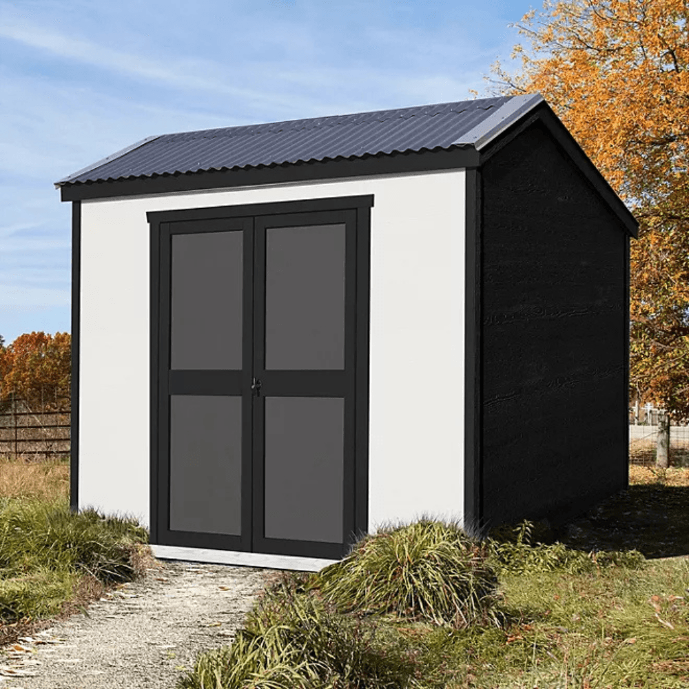 Comes with a pre-cut DIY kit for easy and efficient assembly. The kit includes pre-cut wood materials, a complete floor system, roof system, fasteners, and a handle. Step-by-step instructions make installation possible in 6-8 hours with the 2×4 EZ frame construction and polycarbonate roof. The pre-primed siding allows for easy painting and caulking after assembly to waterproof the shed.