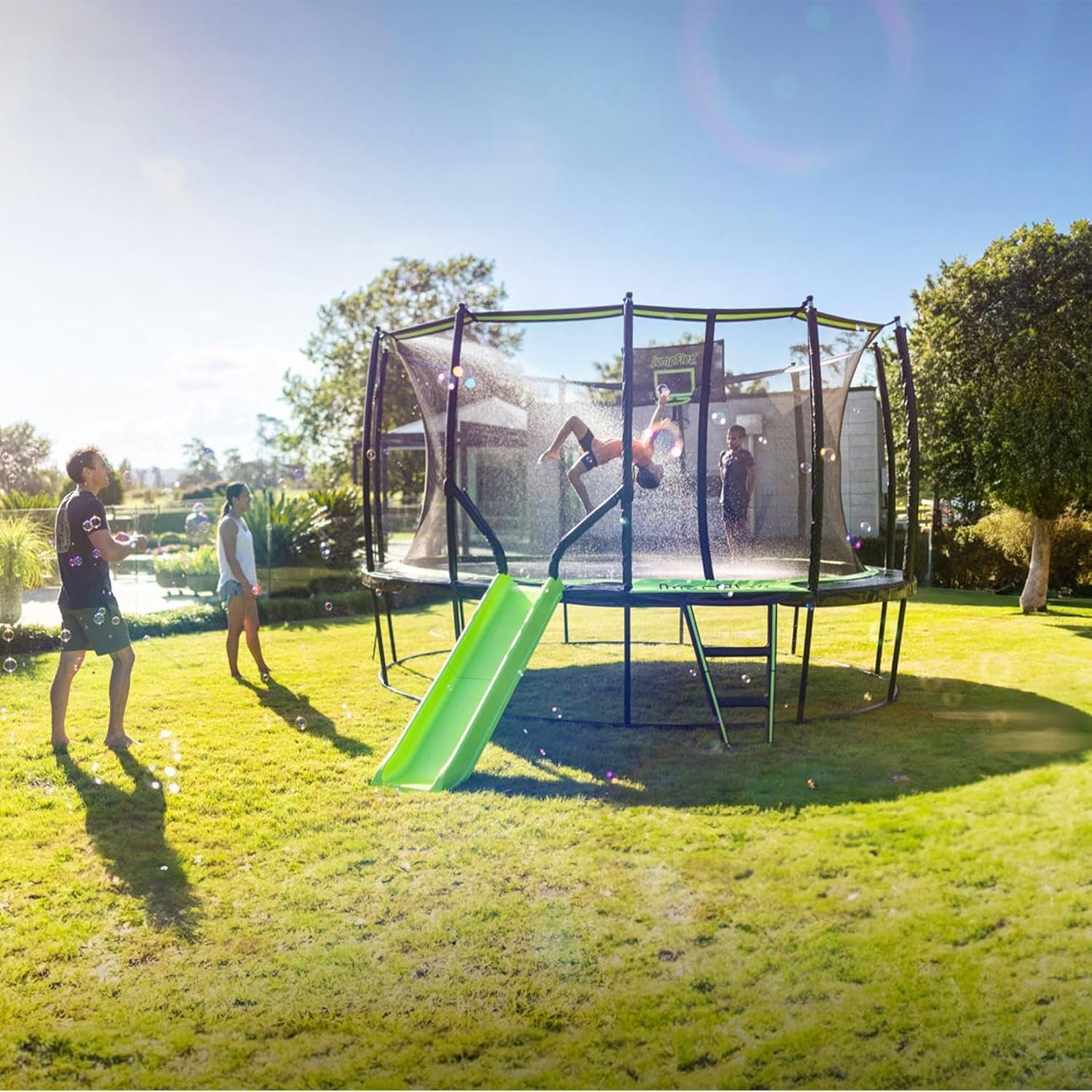- Assembly: Effortless assembly with 0 bolts and no welds for a quick setup compared to other recreational trampolines; 15.6-foot in diameter at the widest point, and a minimum 17-foot yard space is needed