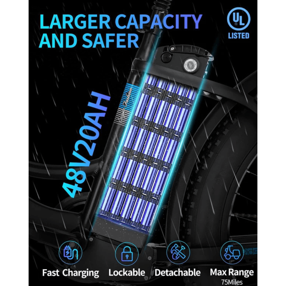 • Long-Range Battery: The 48V/20AH waterproof battery powers you for 75–90 miles on a single charge, with a removable design for easy charging and enhanced safety.