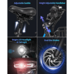 • Integrated LED Lighting: Rear-mounted LED headlights and taillights ensure clear visibility during night rides.