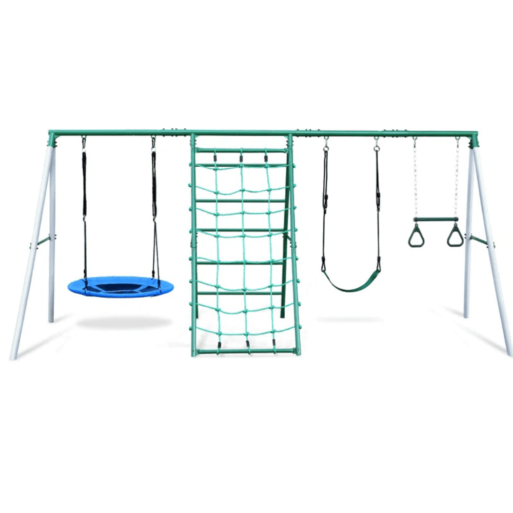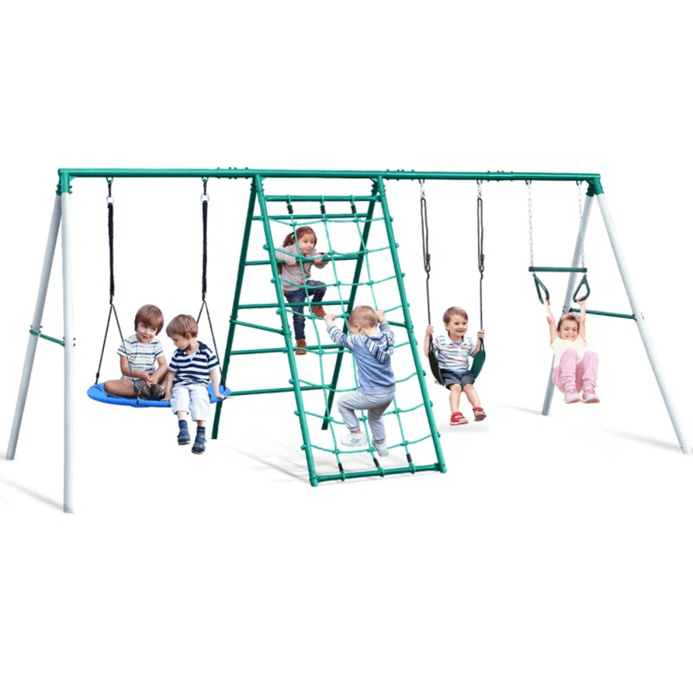 Bring the ultimate adventure to your backyard with this multi-activity swing set, designed to keep kids active and entertained for hours. Featuring a belt swing, a spacious saucer swing, a climbing ladder, a climbing net, and a trapeze bar, this playset offers endless fun and physical challenges that promote balance, coordination, and strength.